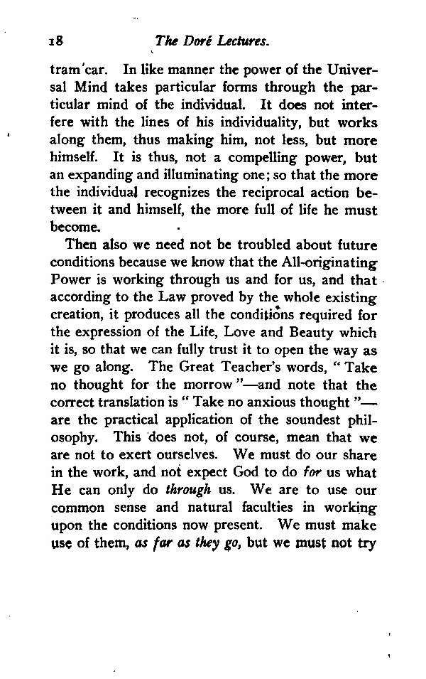 Then also we need not be troubled about future conditions because we know that the All-originating Power is working through us and for us, and that according to the Law proved by the whole existing creation, it produces all the conditions required for the expression of the Life, Love and Beauty which it is, so that we can fully trust it to open the way as we go along. The Great Teacher's words, "Take no thought for the morrow"--and note that the correct translation is "Take no anxious thought"-- are the practical application of the soundest philosophy. This does not, of course, mean that we are not to exert ourselves. We must do our share in the work, and not expect God to do for us what He can only do through us. We are to use our common sense and natural faculties in working upon the conditions now present. We must make use of them, as far as they go, but we must not try