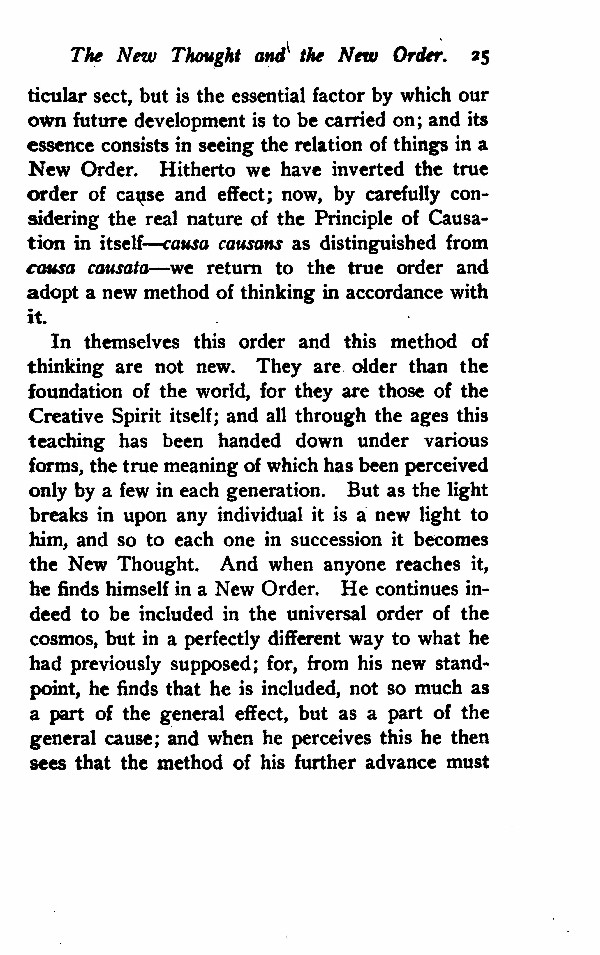 In themselves this order and this method of thinking are not new. They are older than the foundation of the world, for they are those of the Creative Spirit itself; and all through the ages this teaching has been handed down under various forms, the true meaning of which has been perceived only by a few in each generation. But as the light breaks in upon any individual it is a new light to him, and so to each one in succession it becomes the New Thought. And when anyone reaches it, he finds himself in a New Order. He continues indeed to be included in the universal order of the cosmos, but in a perfectly different way to what he had previously supposed; for, from his new standpoint, he finds that he is included, not so much as a part of the general effect, but as a part of the general cause; and when he perceives this he then sees that the method of his further advance must