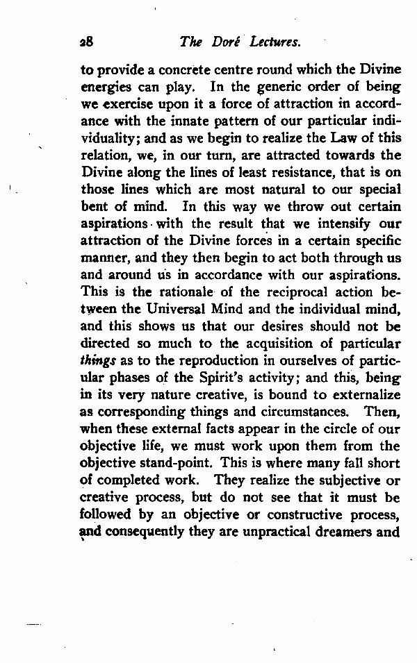 to provide a concrete centre round which the Divine energies can play. In the generic order of being we exercise upon it a force of attraction in accordance with the innate pattern of our particular individuality; and as we begin to realize the Law of this relation, we, in our turn, are attracted towards the Divine along the lines of least resistance, that is on those lines which are most natural to our special bent of mind. In this way we throw out certain aspirations with the result that we intensify our attraction of the Divine forces in a certain specific manner, and they then begin to act both through us and around us in accordance with our aspirations. This is the rationale of the reciprocal action between the Universal Mind and the individual mind, and this shows us that our desires should not be directed so much to the acquisition of particular things as to the reproduction in ourselves of particular phases of the Spirit's activity; and this, being in its very nature creative, is bound to externalize as corresponding things and circumstances. Then, when these external facts appear in the circle of our objective life, we must work upon them from the objective stand-point. This is where many fall short of completed work. They realize the subjective or creative process, but do not see that it must be followed by an objective or constructive process, and consequently they are unpractical dreamers and