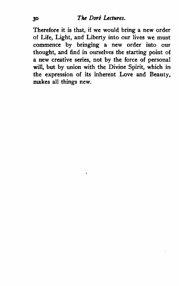 Therefore it is that, if we would bring a new order of Life, Light, and Liberty into our lives we must commence by bringing a new order into our thought, and find in ourselves the starting point of a new creative series, not by the force of personal will, but by union with the Divine Spirit, which in the expression of its inherent Love and Beauty, makes all things new.