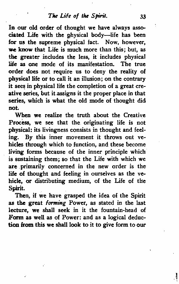 In our old order of thought we have always associated Life with the physical body--life has been for us the supreme physical fact. Now, however, we know that Life is much more than this; but, as the greater includes the less, it includes physical life as one mode of its manifestation. The true order does not require us to deny the reality of physical life or to call it an illusion; on the contrary it sees in physical life the completion of a great creative series, but it assigns it the proper place in that series, which is what the old mode of thought did not.