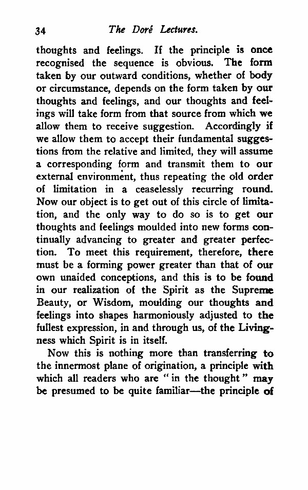 thoughts and feelings. If the principle is once recognised the sequence is obvious. The form taken by our outward conditions, whether of body or circumstance, depends on the form taken by our thoughts and feelings, and our thoughts and feelings will take form from that source from which we allow them to receive suggestion. Accordingly if we allow them to accept their fundamental suggestions from the relative and limited, they will assume a corresponding form and transmit them to our external environment, thus repeating the old order of limitation in a ceaselessly recurring round. Now our object is to get out of this circle of limitation, and the only way to do so is to get our thoughts and feelings moulded into new forms continually advancing to greater and greater perfection. To meet this requirement, therefore, there must be a forming power greater than that of our own unaided conceptions, and this is to be found in our realization of the Spirit as the Supreme Beauty, or Wisdom, moulding our thoughts and feelings into shapes harmoniously adjusted to the fullest expression, in and through us, of the Livingness which Spirit is in itself.