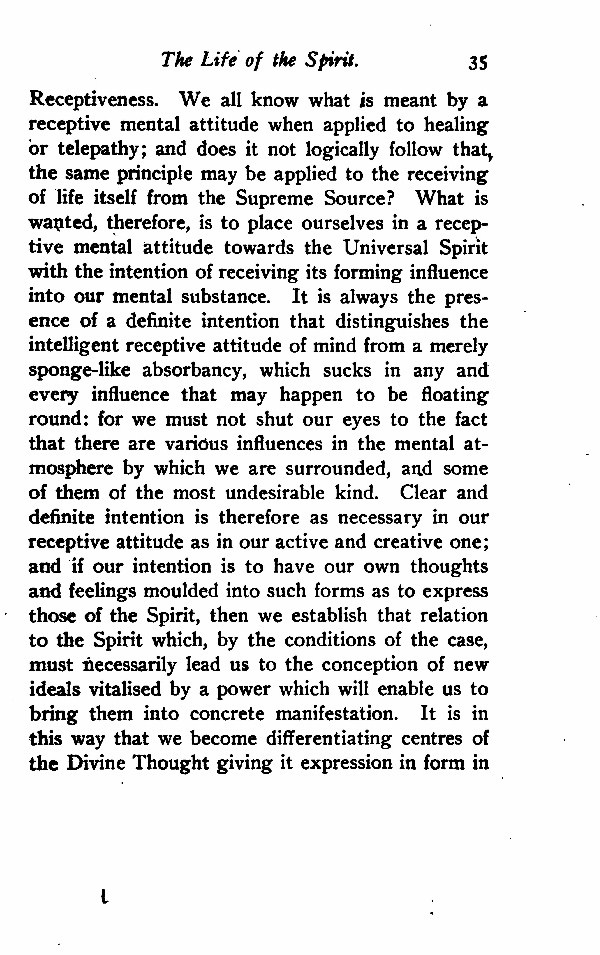 Receptiveness. We all know what is meant by a receptive mental attitude when applied to healing or telepathy; and does it not logically follow that the same principle may be applied to the receiving of life itself from the Supreme Source? What is wanted, therefore, is to place ourselves in a receptive mental attitude towards the Universal Spirit with the intention of receiving its forming influence into our mental substance. It is always the presence of a definite intention that distinguishes the intelligent receptive attitude of mind from a merely sponge-like absorbency, which sucks in any and every influence that may happen to be floating round: for we must not shut our eyes to the fact that there are various influences in the mental atmosphere by which we are surrounded, and some of them of the most undesirable kind. Clear and definite intention is therefore as necessary in our receptive attitude as in our active and creative one; and if our intention is to have our own thoughts and feelings moulded into such forms as to express those of the Spirit, then we establish that relation to the Spirit which, by the conditions of the case, must necessarily lead us to the conception of new ideals vitalised by a power which will enable us to bring them into concrete manifestation. It is in this way that we become differentiating centres of the Divine Thought giving it expression in form in