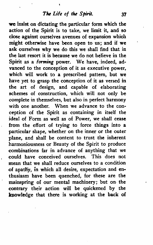 we insist on dictating the particular form which the action of the Spirit is to take, we limit it, and so close against ourselves avenues of expansion which might otherwise have been open to us; and if we ask ourselves why we do this we shall find that in the last resort it is because we do not believe in the Spirit as a forming power. We have, indeed, advanced to the conception of it as executive power, which will work to a prescribed pattern, but we have yet to grasp the conception of it as versed in the art of design, and capable of elaborating schemes of construction, which will not only be complete in themselves, but also in perfect harmony with one another. When we advance to the conception of the Spirit as containing in itself the ideal of Form as well as of Power, we shall cease from the effort of trying to force things into a particular shape, whether on the inner or the outer plane, and shall be content to trust the inherent harmoniousness or Beauty of the Spirit to produce combinations far in advance of anything that we could have conceived ourselves. This does not mean that we shall reduce ourselves to a condition of apathy, in which all desire, expectation and enthusiasm have been quenched, for these are the mainspring of our mental machinery; but on the contrary their action will be quickened by the knowledge that there is working at the back of