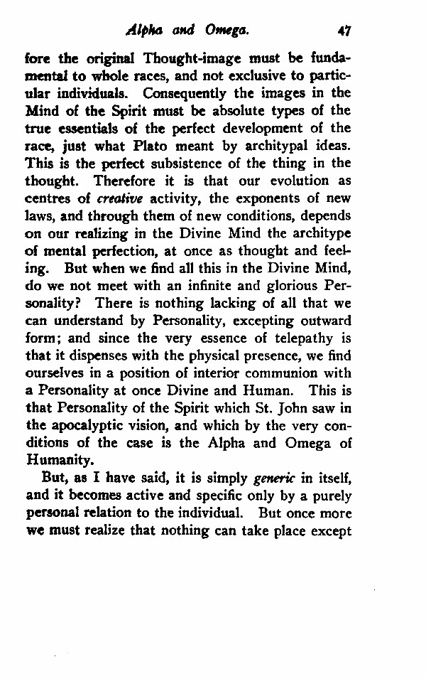 the original Thought-image must be fundamental to whole races, and not exclusive to particular individuals. Consequently the images in the Mind of the Spirit must be absolute types of the true essentials of the perfect development of the race, just what Plato meant by archetypal ideas. This is the perfect subsistence of the thing in the thought. Therefore it is that our evolution as centres of creative activity, the exponents of new laws, and through them of new conditions, depends on our realizing in the Divine Mind the archetype of mental perfection, at once as thought and feeling. But when we find all this in the Divine Mind, do we not meet with an infinite and glorious Personality? There is nothing lacking of all that we can understand by Personality, excepting outward form; and since the very essence of telepathy is that it dispenses with the physical presence, we find ourselves in a position of interior communion with a Personality at once Divine and Human. This is that Personality of the Spirit which St. John saw in the apocalyptic vision, and which by the very conditions of the case is the Alpha and Omega of Humanity.