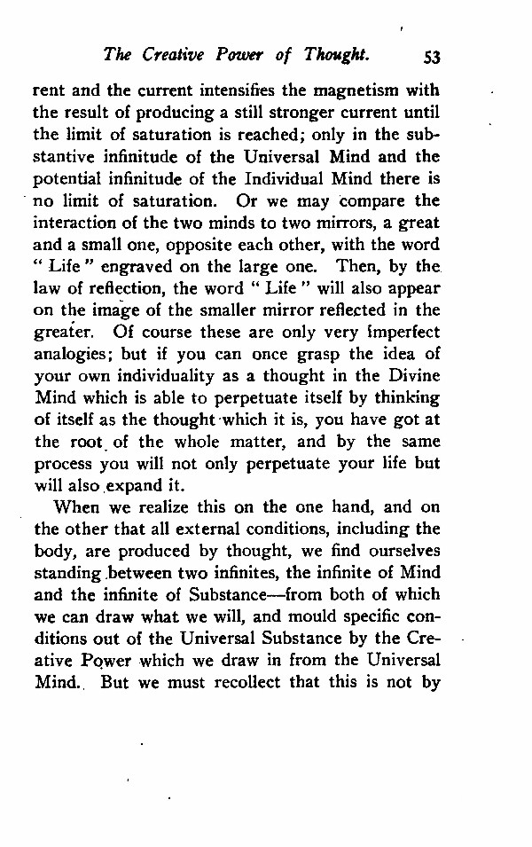 and the current intensifies the magnetism with the result of producing a still stronger current until the limit of saturation is reached; only in the substantive infinitude of the Universal Mind and the potential infinitude of the Individual Mind there is no limit of saturation. Or we may compare the interaction of the two minds to two mirrors, a great and a small one, opposite each other, with the word "Life" engraved on the large one. Then, by the law of reflection, the word "Life" will also appear on the image of the smaller mirror reflected in the greater. Of course these are only very imperfect analogies; but if you car once grasp the idea of your own individuality as a thought in the Divine Mind which is able to perpetuate itself by thinking of itself as the thought which it is, you have got at the root of the whole matter, and by the same process you will not only perpetuate your life but will also expand it.