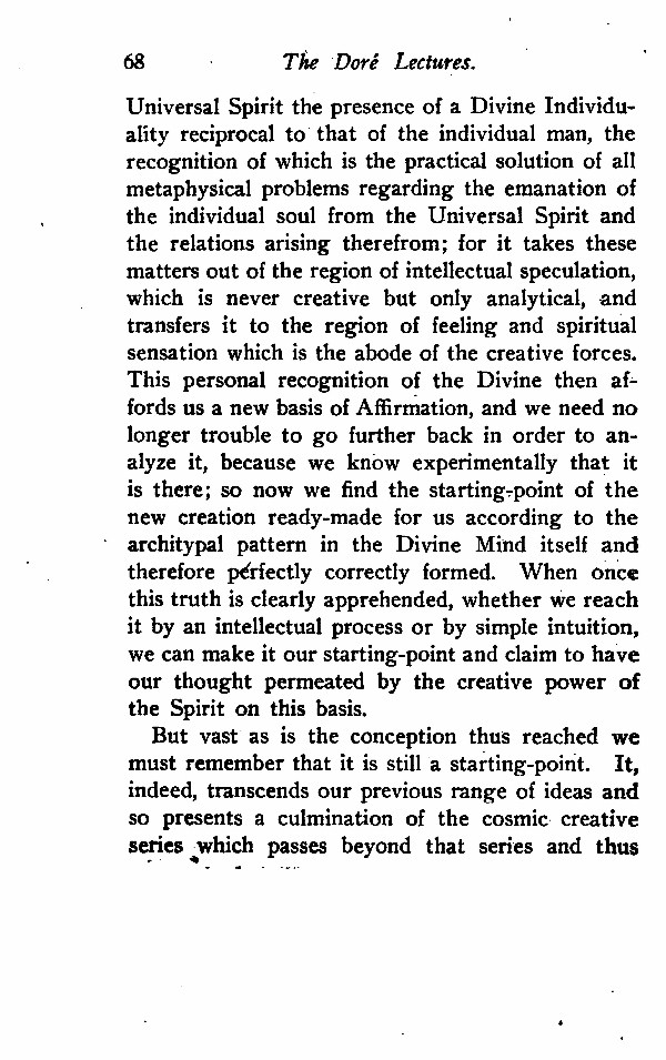Universal Spirit the presence of a Divine Individuality reciprocal to that of the individual man, the recognition of which is the practical solution of all metaphysical problems regarding the emanation of the individual soul from the Universal Spirit and the relations arising there from; for it takes these matters out of the region of intellectual speculation, which is never creative but only analytical, and transfers it to the region of feeling and spiritual sensation which is the abode of the creative forces. This personal recognition of the Divine then affords us a new basis of Affirmation, and we need no longer trouble to go further back in order to analyze it, because we know experimentally that it is there; so now we find the starting-point of the new creation ready-made for us according to the archetypal pattern in the Divine Mind itself and therefore perfectly correctly formed. When once this truth is clearly apprehended, whether we reach it by an intellectual process or by simple intuition, we can make it our starting-point and claim to have our thought permeated by the creative power of the Spirit on this basis.