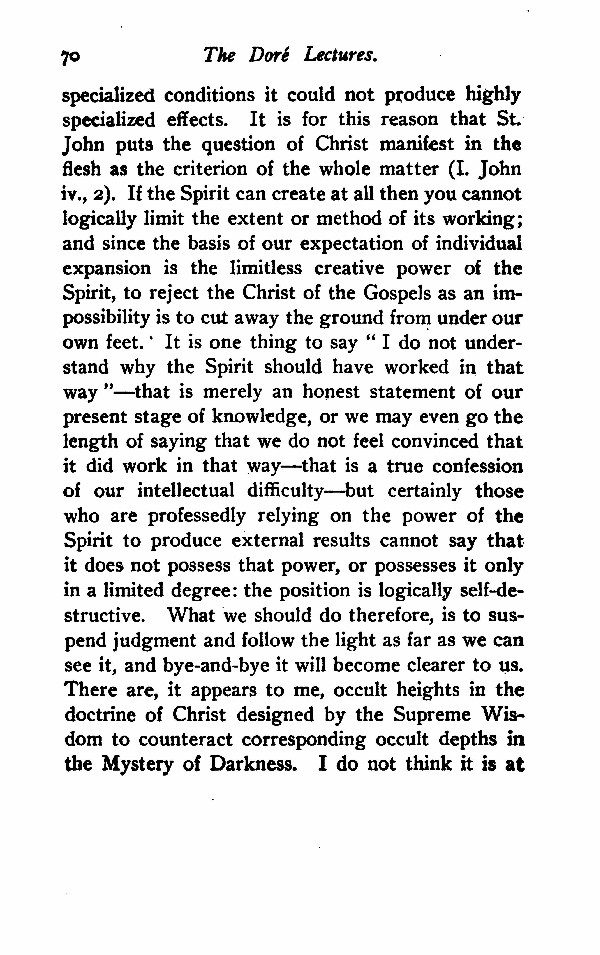 specialized conditions it could not produce highly specialized effects. It is for this reason that St. John puts the question of Christ manifest in the flesh as the criterion of the whole matter (I. John iv., 2). If the Spirit can create at all then you cannot logically limit the extent or method of its working; and since the basis of our expectation of individual expansion is the limitless creative power of the Spirit, to reject the Christ of the Gospels as an impossibility is to cut away the ground from under our own feet. It is one thing to say "I do not understand why the Spirit should have worked in that way"--that is merely an honest statement of our present stage of knowledge, or we may even go the length of saying that we do not feel convinced that it did work in that way--that is a true confession of our intellectual difficulty--but certainly those who are professedly relying on the power of the Spirit to produce external results cannot say that it does not possess that power, or possesses it only in a limited degree: the position is logically self-destructive. What we should do therefore, is to suspend judgment and follow the light as far as we can see it, and bye-and-bye it will become clearer to us. There are, it appears to me, occult heights in the doctrine of Christ designed by the Supreme Wisdom to counteract corresponding occult depths in the Mystery of Darkness. I do not think it is at
