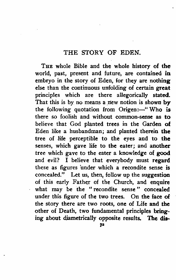 The whole Bible and the whole history of the world, past, present and future, are contained in embryo in the story of Eden, for they are nothing else than the continuous unfolding of certain great principles which are there allegorically stated. That this is by no means a new notion is shown by the following quotation from Origen:-- "Who is there so foolish and without common-sense as to believe that God planted trees in the Garden of Eden like a husbandman; and planted therein the tree of life perceptible to the eyes and to the senses, which gave life to the eater; and another tree which gave to the eater a knowledge of good and evil? I believe that everybody must regard these as figures under which a recondite sense is concealed." Let us, then, follow up the suggestion of this early Father of the Church, and enquire what may be the "recondite sense" concealed under this figure of the two trees. On the face of the story there are two roots, one of Life and the other of Death, two fundamental principles bringing about diametrically opposite results. The