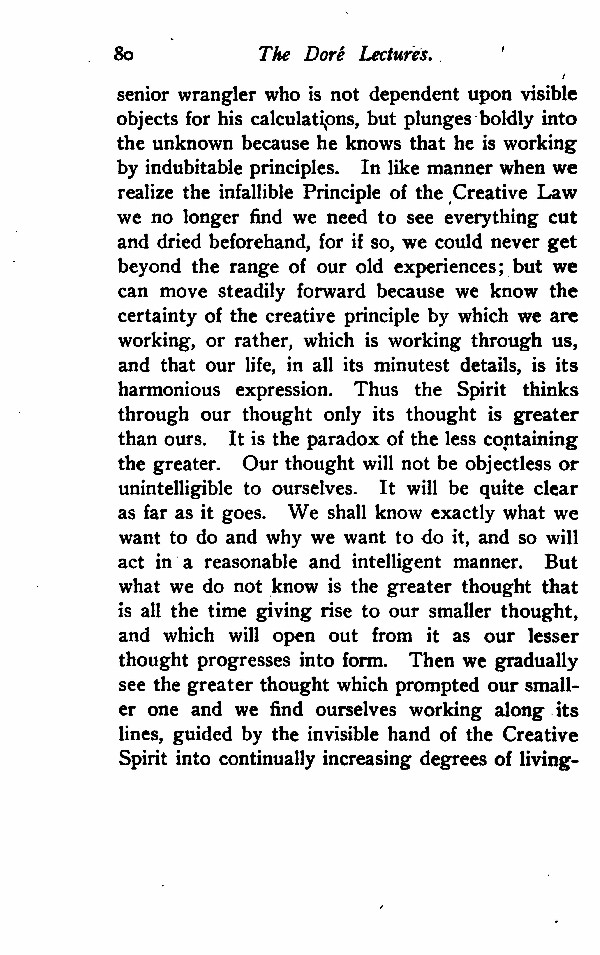 senior wrangler who is not dependent upon visible objects for his calculations, but plunges boldly into the unknown because he knows that he is working by indubitable principles. In like manner when we realize the infallible Principle of the Creative Law we no longer find we need to see everything cut and dried beforehand, for if so, we could never get beyond the range of our old experiences; but we can move steadily forward because we know the certainty of the creative principle by which we are working, or rather, which is working through us, and that our life, in all its minutes" details, is its harmonious expression. Thus the Spirit thinks through our thought only its thought is greater than ours. It is the paradox of the less containing the greater. Our thought will not be objectless or unintelligible to ourselves. It will be quite clear as far as it goes. We shall know exactly what we want to do and why we want to do it, and so will act in a reasonable and intelligent manner. But what we do not know is the greater thought that is all the time giving rise to our smaller thought, and which will open out from it as our lesser thought progresses into form. Then we gradually see the greater thought which prompted our smaller one and we find ourselves working along its lines, guided by the invisible hand of the Creative Spirit into continually increasing degrees of livingness