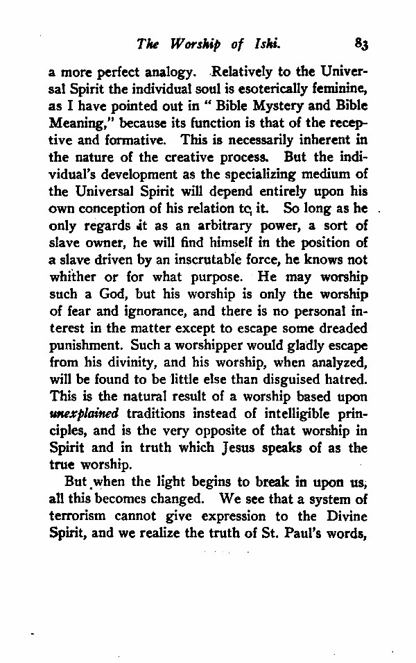 a more perfect analogy. Relatively to the Universal Spirit the individual soul is esoterically feminine, as I have pointed out in "Bible Mystery and Bible Meaning," because its function is that of the receptive and formative. This is necessarily inherent in the nature of the creative process. But the individual's development as the specializing medium of the Universal Spirit will depend entirely upon his own conception of his relation to it. So long as he only regards it as an arbitrary power, a sort of slave owner, he will find himself in the position of a slave driven by an inscrutable force, he knows not whither or for what purpose. He may worship such a God, but his worship is only the worship of fear and ignorance, and there is no personal interest in the matter except to escape some dreaded punishment. Such a worshipper would gladly escape from his divinity, and his worship, when analyzed, will be found to be little else than disguised hatred. This is the natural result of a worship based upon unexplained traditions instead of intelligible principles, and is the very opposite of that worship in Spirit and in truth which Jesus speaks of as the true worship.