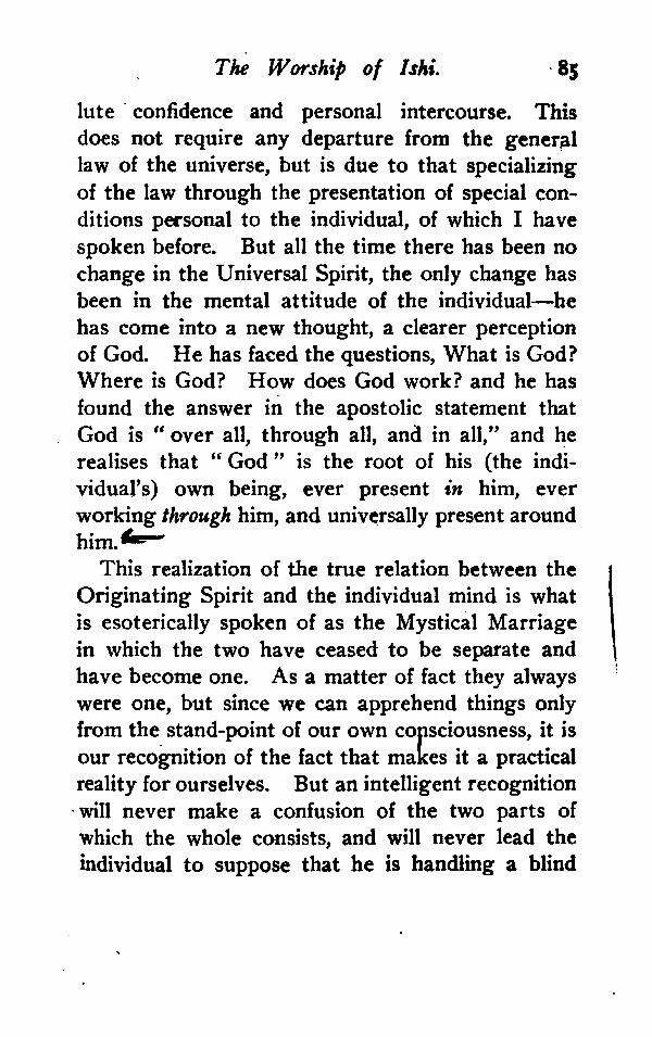 This realization of the true relation between the Originating Spirit and the individual mind is what is esoterically spoken of as the Mystical Marriage in which the two have ceased to be separate and have become one. As a matter of fact they always were one, but since we can apprehend things only from the stand-point of our own consciousness, it is our recognition of the fact that makes it a practical reality for ourselves. But an intelligent recognition will never make a confusion of the two parts of which the whole consists, and will never lead the individual to suppose that he is handling a blind