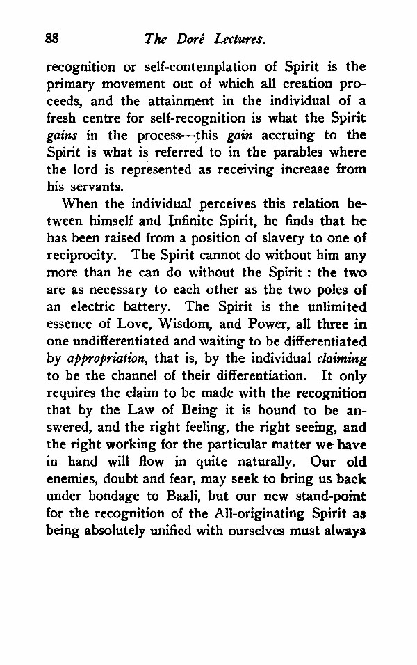 When the individual perceives this relation between himself and Infinite Spirit, he finds that he has been raised from a position of slavery to one of reciprocity. The Spirit cannot do without him any more than he can do without the Spirit: the two are as necessary to each other as the two poles of an electric battery. The Spirit is the unlimited essence of Love, Wisdom, and Power, all three in one undifferentiated and waiting to be differentiated by appropriation, that is, by the individual claiming to be the channel of their differentiation. It only requires the claim to be made with the recognition that by the Law of Being it is bound to be answered, and the right feeling, the right seeing, and the right working for the particular matter we have in hand will flow in quite naturally. Our old enemies, doubt and fear, may seek to bring us back under bondage to Baali, but our new stand-point for the recognition of the All-originating Spirit as being absolutely unified with ourselves must always