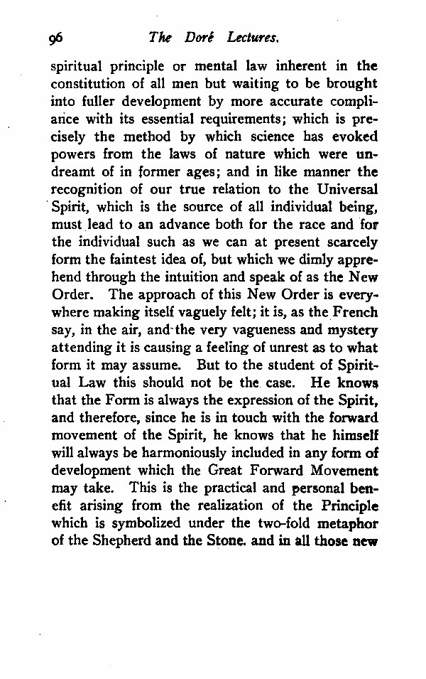 spiritual principle or mental law inherent in the constitution of all men but waiting to be brought into fuller development by more accurate compliance with its essential requirements; which is precisely the method by which science has evoked powers from the laws of nature which were undreamt of in former ages; and in like manner the recognition of our true relation to the Universal Spirit, which is the source of all individual being, must lead to an advance both for the race and for the individual such as we can at present scarcely form the faintest idea of, but which we dimly apprehend through the intuition and speak of as the New Order. The approach of this New Order is everywhere making itself vaguely felt; it is, as the French say, in the air, and the very vagueness and mystery attending it is causing a feeling of unrest as to what form it may assume. But to the student of Spiritual Law this should not be the case. He knows that the Form is always the expression of the Spirit, and therefore, since he is in touch with the forward movement of the Spirit, he knows that he himself will always be harmoniously included in any form of development which the Great Forward Movement may take. This is the practical and personal benefit arising from the realization of the Principle which is symbolized under the two-fold metaphor of the Shepherd and the Stone. and in all those new