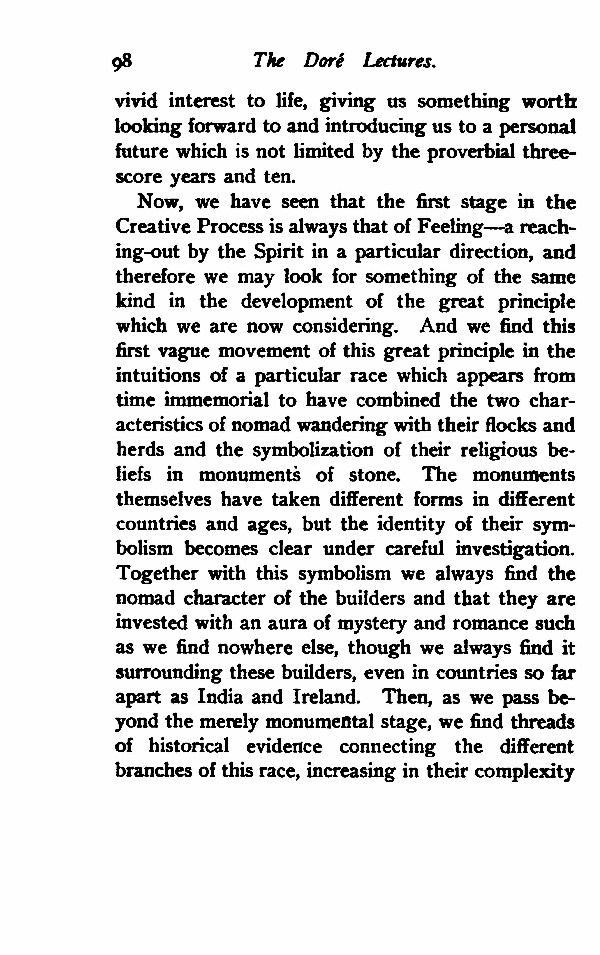 Now, we have seen that the first stage in the Creative Process is always that of Feeling--a reaching-out by the Spirit in a particular direction, and therefore we may look for something of the same kind in the development of the great principle which we are now considering. And we find this first vague movement of this great principle in the intuitions of a particular race which appears from time immemorial to have combined the two characteristics of nomad wandering with their flocks and herds and the symbolization of their religious beliefs in monuments of stone. The monuments themselves have taken different forms in different countries and ages, but the identity of their symbolism becomes clear under careful investigation. Together with this symbolism we always find the nomad character of the builders and that they are invested with an aura of mystery and romance such as we find nowhere else, though we always find it surrounding these builders, even in countries so far apart as India and Ireland. Then, as we pass beyond the merely monumental stage, we find threads of historical evidence connecting the different branches of this race, increasing in their complexity