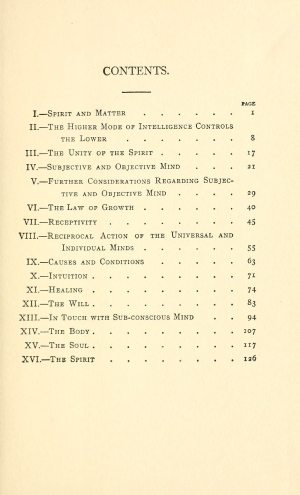 Contents - Foreword - Spirit And Matter - The Higher Mode of Intelligence Controls The Lower - Unity of The Spirit - Subjective And Objective Mind - Further Consideration Regarding Subjective and Objective Mind - Law of Growth - Receptivity - Reciprocal Action of The Universal And Individual Minds - Causes And Conditions - Intuition - Healing - The Will - In Touch With Subconscious - Body - Soul - Spirit -