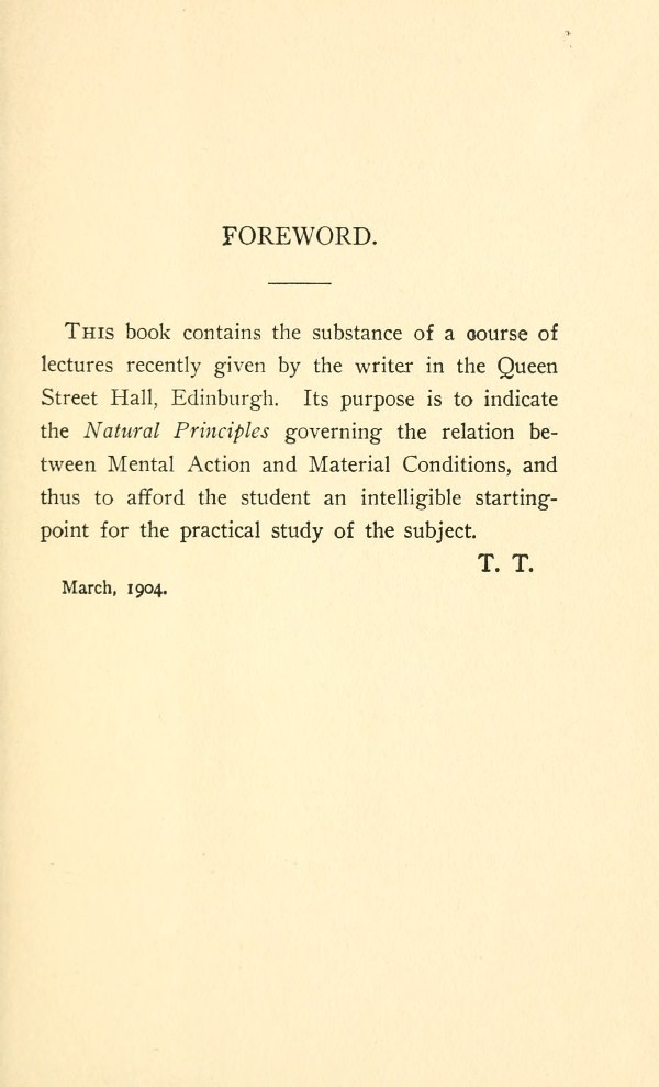 THIS book contains the substance of a course of lectures recently given by the writer in the Queen Street Hall, Edinburgh. Its purpose is to indicate the Natural Principles governing the relation between Mental Action and Material Conditions, and thus to afford the student an intelligible starting point for the practical study of the subject.
