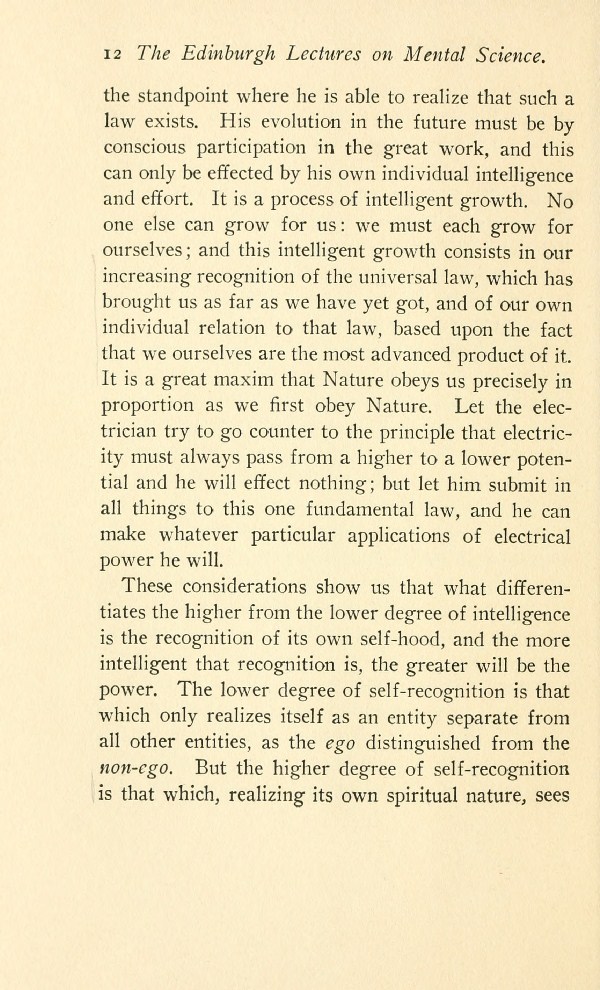 These considerations show us that what differentiates the higher from the lower degree of intelligence is the recognition of its own self-hood, and the more intelligent that recognition is, the greater will be the power. The lower degree of self-recognition is that which only realizes itself as an entity separate from all other entities, as the ego distinguished from the non-ego. But the higher degree of self-recognition is that which, realizing its own spiritual nature, sees