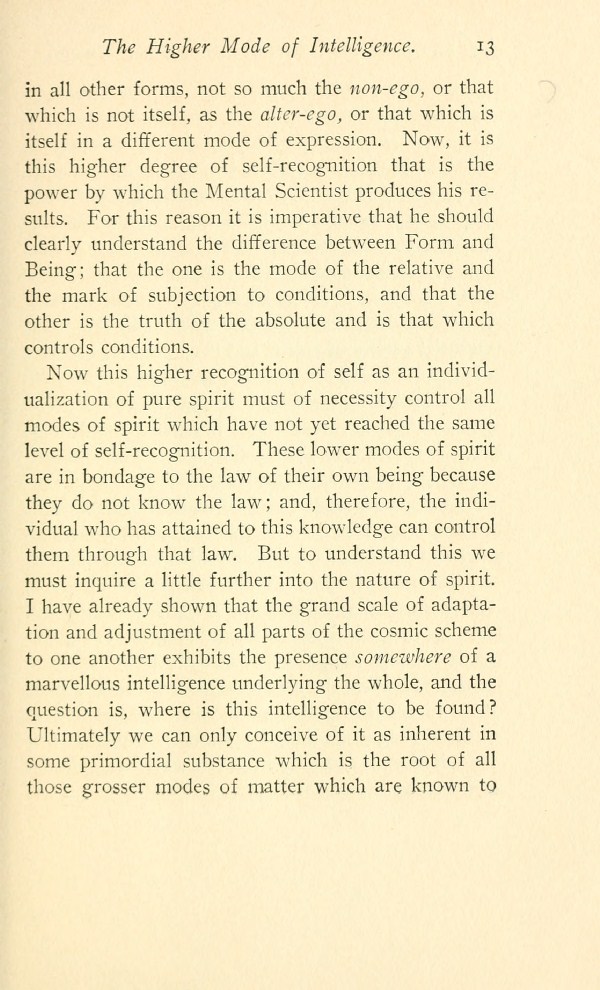 in all other forms, not so much the non-ego, or that which is not itself, as the alter-ego, or that which is itself in a different mode of expression. Now, it is this higher degree of self-recognition that is the power by which the Mental Scientist produces his results. For this reason it is imperative that he should clearly understand the difference between Form and Being; that the one is the mode of the relative and the mark of subjection to conditions, and that the other is the truth of the absolute and is that which controls conditions.