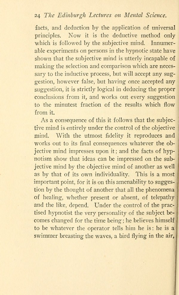 facts, and deduction by the application of universal principles. Now it is the deductive method only which is followed by the subjective mind. Innumerable experiments on persons in the hypnotic state have shown that the subjective mind is utterly incapable of making the selection and comparison which are necessary to the inductive process, but will accept any suggestion, however false, but having once accepted any suggestion, it is strictly logical in deducing the proper conclusions from it, and works out every suggestion to the minutest fraction of the results which flow from it.