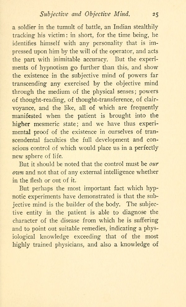 But perhaps the most important fact which hypnotic experiments have demonstrated is that the subjective mind is the builder of the body. The subjective entity in the patient is able to diagnose the character of the disease from which he is suffering and to point out suitable remedies, indicating a physiological knowledge exceeding that of the most highly trained physicians, and also a knowledge