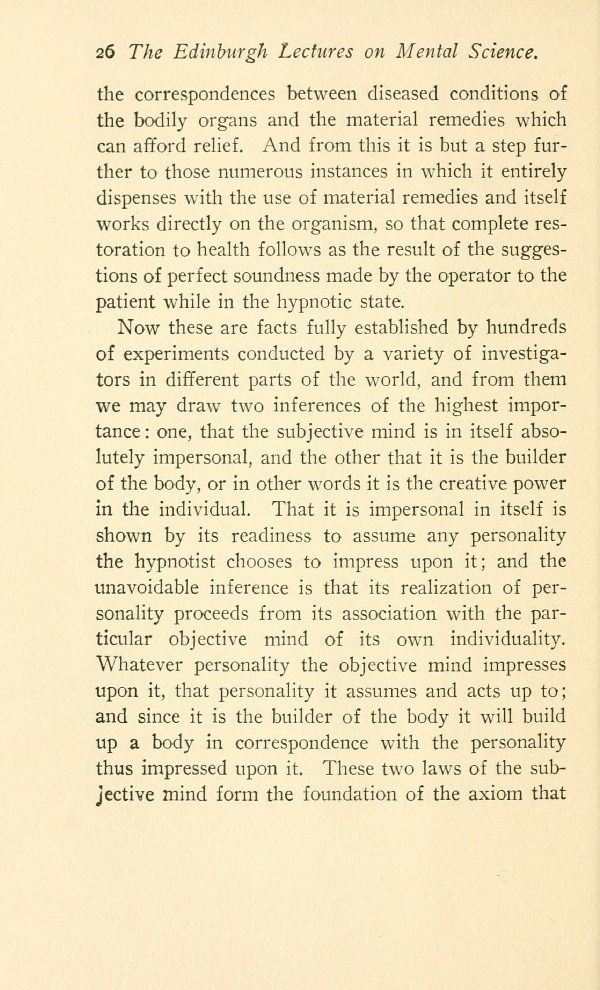 Now these are facts fully established by hundreds of experiments conducted by a variety of investigators in different parts of the world, and from them we may draw two inferences of the highest importance: one, that the subjective mind is in itself absolutely impersonal, and the other that it is the builder of the body, or in other words it is the creative power in the individual. That it is impersonal in itself is shown by its readiness to assume any personality the hypnotist chooses to impress upon it; and the unavoidable inference is that its realization of personality proceeds from its association with the particular objective mind of its own individuality. Whatever personality the objective mind impresses upon it, that personality it assumes and acts up to; and since it is the builder of the body it will build up a body in correspondence with the personality thus impressed upon it. These two laws of the subjective mind form the foundation of the axiom that