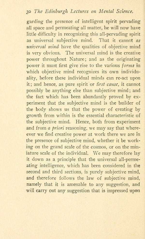 Contents - Foreword - Spirit And Matter - The Higher Mode of Intelligence Controls The Lower - Unity of The Spirit - Subjective And Objective Mind - Further Consideration Regarding Subjective and Objective Mind - Law of Growth - Receptivity - Reciprocal Action of The Universal And Individual Minds - Causes And Conditions - Intuition - Healing - The Will - In Touch With Subconscious - Body - Soul - Spirit -