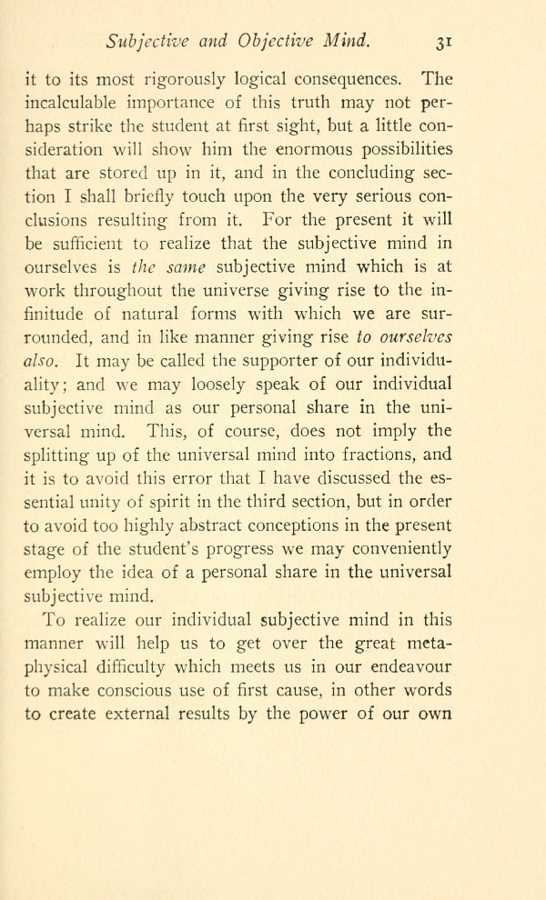 it to its most rigorously logical consequences. The incalculable importance of this truth may not perhaps strike the student at first sight, but a little consideration will show him the enormous possibilities that are stored up in it, and in the concluding section I shall briefly touch upon the very serious conclusions resulting from it. For the present it will be sufficient to realize that the subjective mind in ourselves is the same subjective mind which is at work throughout the universe giving rise to the infinitude of natural forms with which we are surrounded, and in like manner giving rise to ourselves also. It may be called the supporter of our individuality; and we may loosely speak of our individual subjective mind as our personal share in the universal mind. This, of course, does not imply the splitting up of the universal mind into fractions, and it is to avoid this error that I have discussed the essential unity of spirit in the third section, but in order to avoid too highly abstract conceptions in the present stage of the student's progress we may conveniently employ the idea of a personal share in the universal subjective mind.