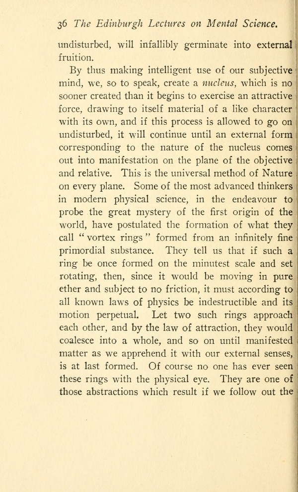 By thus making intelligent use of our subjective mind, we, so to speak, create a nucleus, which is no sooner created than it begins to exercise an attractive force, drawing to itself material of a like character with its own, and if this process is allowed to go on undisturbed, it will continue until an external form corresponding to the nature of the nucleus comes out into manifestation on the plane of the objective and relative. This is the universal method of Nature on every plane. Some of the most advanced thinkers in modern physical science, in the endeavor to probe the great mystery of the first origin of the world, have postulated the formation of what they call "vortex rings" formed from an infinitely fine primordial substance. They tell us that if such a ring be once formed on the minutest scale and set rotating, then, since it would be moving in pure ether and subject to no friction, it must according to all known laws of physics be indestructible and its motion perpetual. Let two such rings approach each other, and by the law of attraction, they would coalesce into a whole, and so on until manifested matter as we apprehend it with our external senses, is at last formed. Of course no one has ever seen these rings with the physical eye. They are one of those abstractions, which result if we follow out the