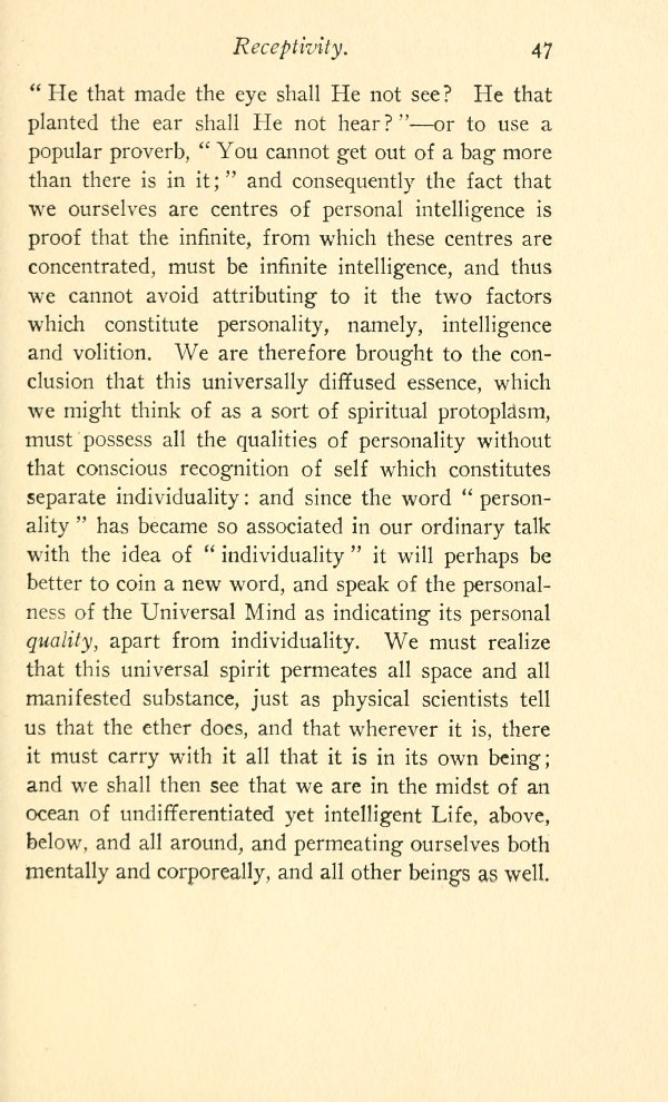 Contents - Foreword - Spirit And Matter - The Higher Mode of Intelligence Controls The Lower - Unity of The Spirit - Subjective And Objective Mind - Further Consideration Regarding Subjective and Objective Mind - Law of Growth - Receptivity - Reciprocal Action of The Universal And Individual Minds - Causes And Conditions - Intuition - Healing - The Will - In Touch With Subconscious - Body - Soul - Spirit -