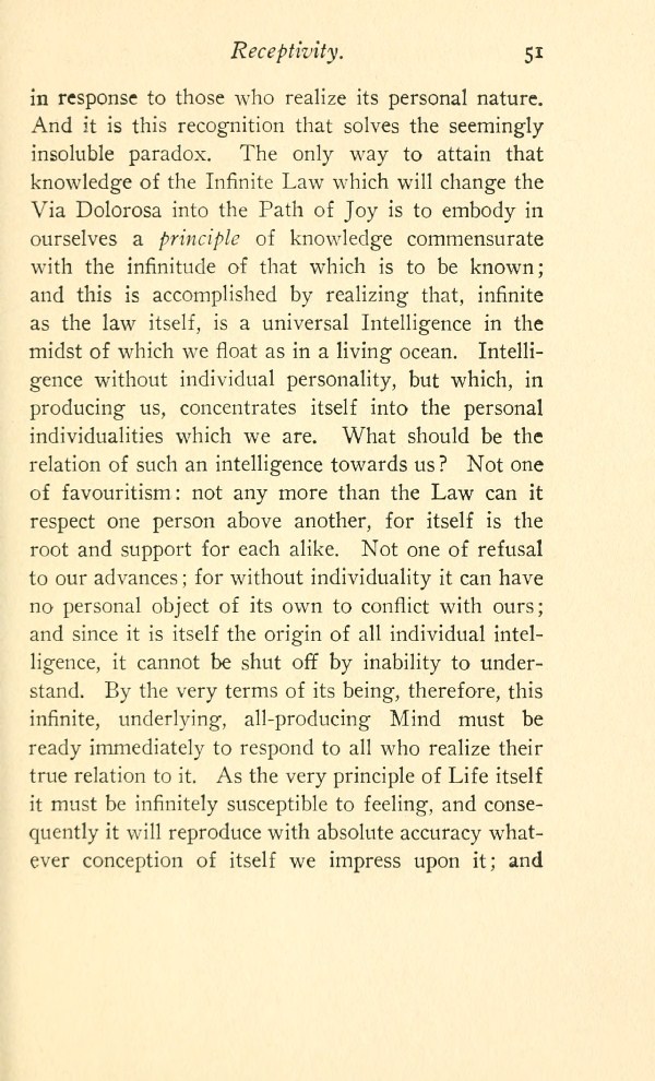 Contents - Foreword - Spirit And Matter - The Higher Mode of Intelligence Controls The Lower - Unity of The Spirit - Subjective And Objective Mind - Further Consideration Regarding Subjective and Objective Mind - Law of Growth - Receptivity - Reciprocal Action of The Universal And Individual Minds - Causes And Conditions - Intuition - Healing - The Will - In Touch With Subconscious - Body - Soul - Spirit -