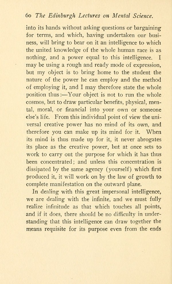 into its hands without asking questions or bargaining for terms, and which, having undertaken our business, will bring to bear on it an intelligence to which the united knowledge of the whole human race is as nothing, and a power equal to this intelligence. I may be using a rough and ready mode of expression, but my object is to bring home to the student the nature of the power he can employ and the method of employing it, and I may therefore state the whole position thus :-Your object is not to run the whole cosmos, but to draw particular benefits, physical, mental, moral, or financial into your own or someone else's life. From this individual point of view the universal creative power has no mind of its own, and therefore you can make up its mind for it. When its mind is thus made up for it, it never abrogates its place as the creative power, but at once sets to work to carry out the purpose for which it has thus been concentrated; and unless this concentration is dissipated by the same agency (yourself) which first produced it, it will work on by the law of growth to complete manifestation on the outward plane.
