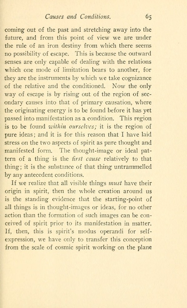 coming out of the past and stretching away into the future, and from this point of view we are under the rule of an iron destiny from which there seems no possibility of escape. This is because the outward senses are only capable of dealing with the relations which one mode of limitation bears to another, for they are the instruments by which we take cognizance of the relative and the conditioned. Now the only way of escape is by rising out of the region of secondary causes into that of primary causation, where the originating energy is to be found before it has yet passed into manifestation as a condition. This region is to be found within ourselves; it is the region of pure ideas; and it is for this reason that I have laid stress on the two aspects of spirit as pure thought and manifested form. The thought-image or ideal pattern of a thing is the first cause relatively to that thing; it is the substance of that thing untrammelled by any antecedent conditions.