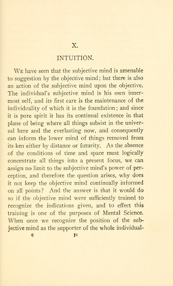 WE have seen that the subjective mind is amenable to suggestion by the objective mind; but there is also an action of the subjective mind upon the objective. The individual's subjective mind is his own innermost self, and its first care is the maintenance of the individuality of which it is the foundation; and since it is pure spirit it has its continual existence in that plane of being where all things subsist in the universal here and the everlasting now, and consequently can inform the lower mind of things removed from its ken either by distance or futurity. As the absence of the conditions of time and space must logically concentrate all things into a present focus, we can assign no limit to the subjective mind's power of perception, and therefore the question arises, why does it not keep the objective mind continually informed on all points? And the answer is that it would do so if the objective mind were sufficiently trained to recognize the indications given, and to effect this training is one of the purposes of Mental Science. When once we recognize the position of the subjective mind as the supporter of the whole individuality
