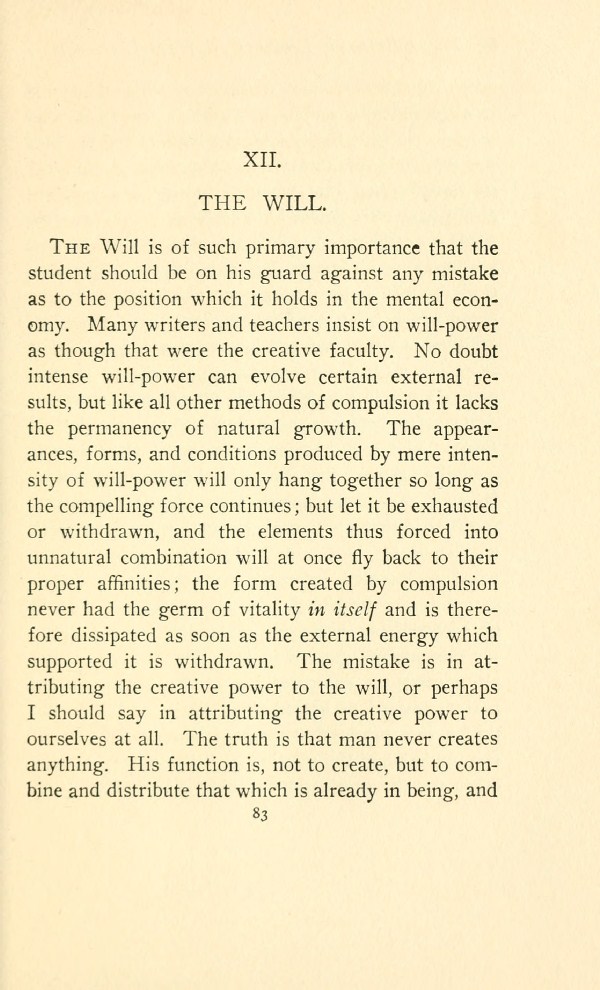 THE Will is of such primary importance that the student should be on his guard against any mistake as to the position which it holds in the mental economy. Many writers and teachers insist on will-power as though that were the creative faculty. No doubt intense will-power can evolve certain external results, but like all other methods of compulsion it lacks the permanency of natural growth. The appearances, forms, and conditions produced by mere intensity of will-power will only hang together so long as the compelling force continues; but let it be exhausted or withdrawn, and the elements thus forced into unnatural combination will at once fly back to their proper affinities; the form created by compulsion never had the germ of vitality in itself and is therefore dissipated as soon as the external energy which supported it is withdrawn. The mistake is in attributing the creative power to the will, or perhaps I should say in attributing the creative power to ourselves at all. The truth is that man never creates anything. His function is, not to create, but to combine and distribute that which is already in being, and