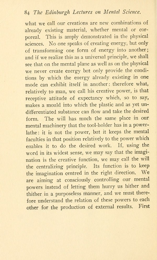what we call our creations are new combinations of already existing material, whether mental or corporeal. This is amply demonstrated in the physical sciences. No one speaks of creating energy, but only of transforming one form of energy into another; and if we realize this as a universal principle, we shall see that on the mental plane as well as on the physical we never create energy but only provide the conditions by which the energy already existing in one mode can exhibit itself in another: therefore what, relatively to man, we call his creative power, is that receptive attitude of expectancy which, so to say, makes a mould into which the plastic and as yet undifferentiated substance can flow and take the desired form. The will has much the same place in our mental machinery that the tool-holder has in a power-lathe: it is not the power, but it keeps the mental faculties in that position relatively to the power which enables it to do the desired work. If, using the word in its widest sense, we may say that the imagination is the creative function, we may call the will the centralizing principle. Its function is to keep the imagination centred in the right direction.