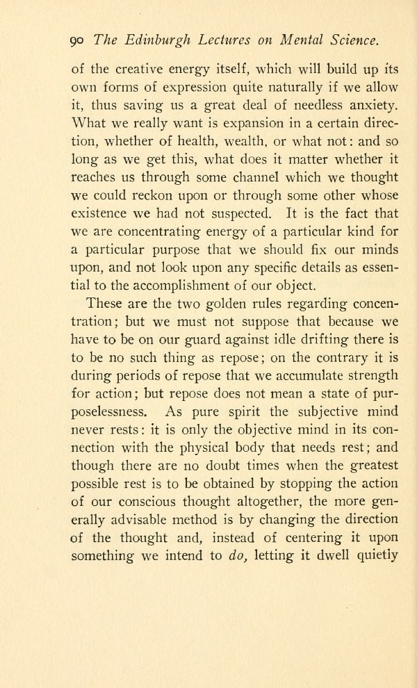 These are the two golden rules regarding concentration; but we must not suppose that because we have to be on our guard against idle drifting there is to be no such thing as repose; on the contrary it is during periods of repose that we accumulate strength for action; but repose does not mean a state of purposelessness. As pure spirit the subjective mind never rests: it is only the objective mind in its connection with the physical body that needs rest; and though there are no doubt times when the greatest possible rest is to be obtained by stopping the action of our conscious thought altogether, the more generally advisable method is by changing the direction of the thought and, instead of centering it upon something we intend to do, letting it dwell quietly