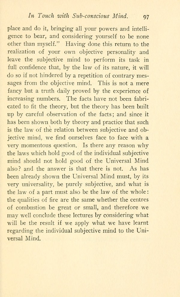 Contents - Foreword - Spirit And Matter - The Higher Mode of Intelligence Controls The Lower - Unity of The Spirit - Subjective And Objective Mind - Further Consideration Regarding Subjective and Objective Mind - Law of Growth - Receptivity - Reciprocal Action of The Universal And Individual Minds - Causes And Conditions - Intuition - Healing - The Will - In Touch With Subconscious - Body - Soul - Spirit -