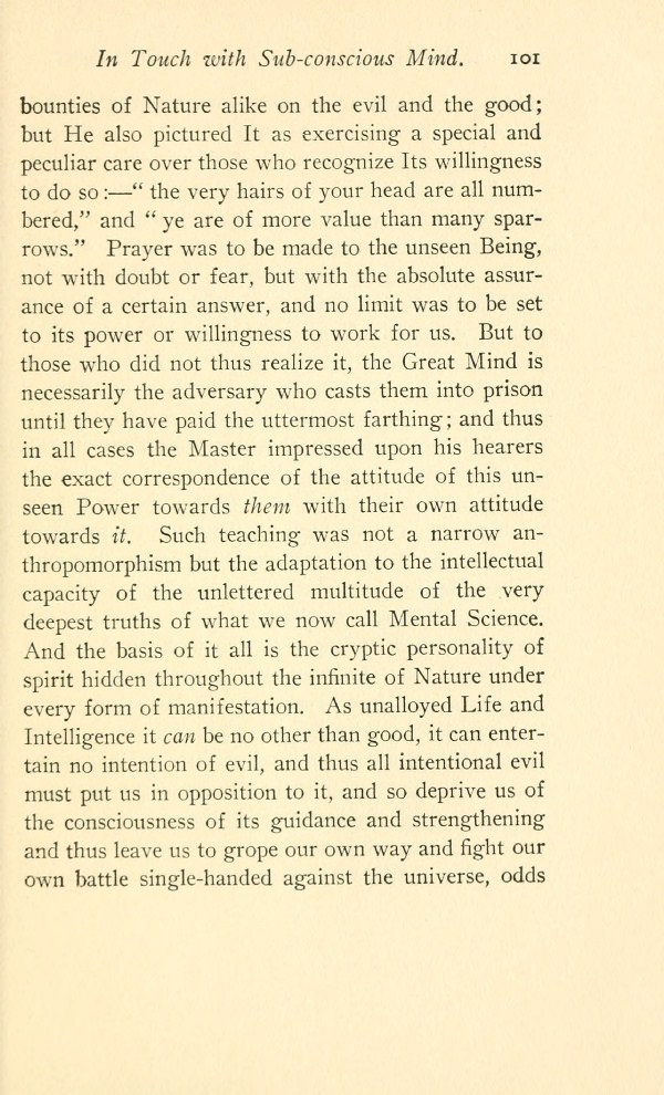 bounties of Nature alike on the evil and the good; but He also pictured It as exercising a special and peculiar care over those who recognize Its willingness to do so --- "the very hairs of your head are all numbered," and "ye are of more value than many sparrows." Prayer was to be made to the unseen Being, not with doubt or fear, but with the absolute assurance of a certain answer, and no limit was to be set to its power or willingness to work for us. But to those who did not thus realize it, the Great Mind is necessarily the adversary who casts them into prison until they have paid the uttermost farthing; and thus in all cases the Master impressed upon his hearers the exact correspondence of the attitude of this unseen Power towards them with their own attitude towards it. Such teaching was not a narrow anthropomorphism but the adaptation to the intellectual capacity of the unlettered multitude of the very deepest truths of what we now call Mental Science. And the basis of it all is the cryptic personality of spirit hidden throughout the infinite of Nature under every form of manifestation.