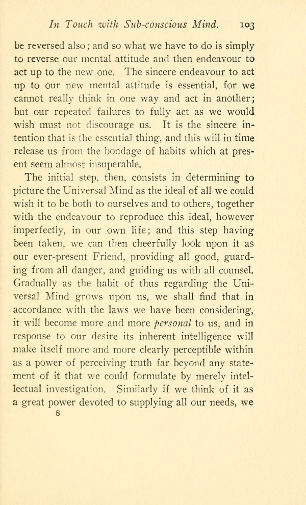 The initial step, then, consists in determining to picture the Universal Mind as the ideal of all we could wish it to be both to ourselves and to others, together with the endeavour to reproduce this ideal, however imperfectly, in our own life; and this step having been taken, we can then cheerfully look upon it as our ever-present Friend, providing all good, guarding from all danger, and guiding us with all counsel. Gradually as the habit of thus regarding the Universal Mind grows upon us, we shall find that in accordance with the laws we have been considering, it will become more and more personal to us, and in response to our desire its inherent intelligence will make itself more and more clearly perceptible within as a power of perceiving truth far beyond any statement of it that we could formulate by merely intellectual investigation. Similarly if we think of it as a great power devoted to supplying all our needs, we