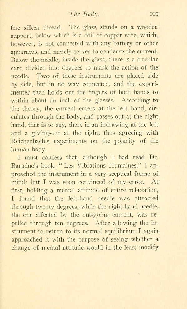 I must confess that, although I had read Dr. Baraduc's book, "Les Vibrations Humaines," I approached the instrument in a very sceptical frame of mind; but I was soon convinced of my error. At first, holding a mental attitude of entire relaxation, I found that the left-hand needle was attracted through twenty degrees, while the right-hand needle, the one affected by the out-going current, was repelled through ten degrees. After allowing the instrument to return to its normal equilibrium I again approached it with the purpose of seeing whether a change of mental attitude would in the least modify