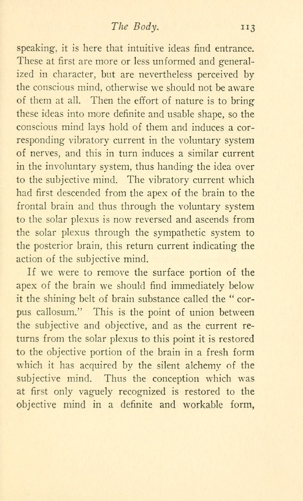 If we were to remove the surface portion of the apex of the brain we should find immediately below it the shining belt of brain substance called the "corpus callosum." This is the point of union between the subjective and objective, and as the current returns from the solar plexus to this point it is restored to the objective portion of the brain in a fresh form which it has acquired by the silent alchemy of the subjective mind. Thus the conception which was at first only vaguely recognized is restored to the objective mind in a definite and workable form,