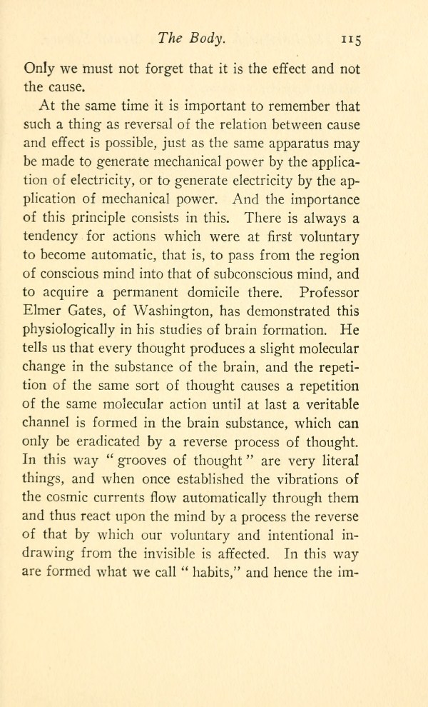 At the same time it is important to remember that such a thing as reversal of the relation between cause and effect is possible, just as the same apparatus may be made to generate mechanical power by the application of electricity, or to generate electricity by the application of mechanical power. And the importance of this principle consists in this. There is always a tendency for actions which were at first voluntary to become automatic, that is, to pass from the region of conscious mind into that of subconscious mind, and to acquire a permanent domicile there. Professor Elmer Gates, of Washington, has demonstrated this physiologically in his studies of brain formation. He tells us that every thought produces a slight molecular change in the substance of the brain, and the repetition of the same sort of thought causes a repetition of the same molecular action until at last a veritable channel is formed in the brain substance, which can only be eradicated by a reverse process of thought. In this way "grooves of thought" are very literal things, and when once established the vibrations of the cosmic currents flow automatically through them and thus react upon the mind by a process the reverse of that by which our voluntary and intentional indrawing from the invisible is affected. In this way are formed what we call "habits," and hence the importance