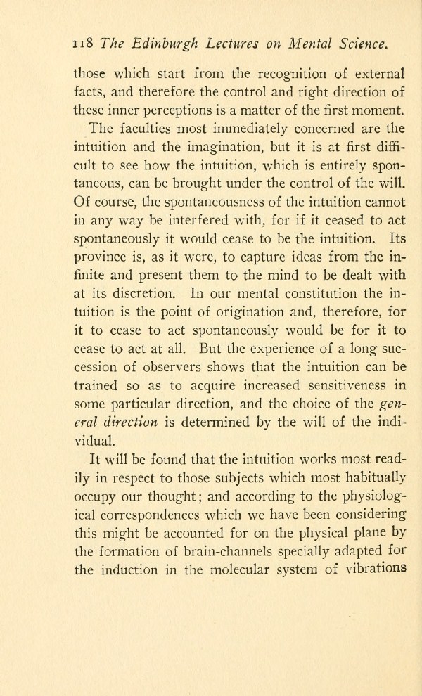 The faculties most immediately concerned are the intuition and the imagination, but it is at first difficult to see how the intuition, which is entirely spontaneous, can be brought under the control of the will. Of course, the spontaneousness of the intuition cannot in any way be interfered with, for if it ceased to act spontaneously it would cease to be the intuition. Its province is, as it were, to capture ideas from the infinite and present them to the mind to be dealt with at its discretion. In our mental constitution the intuition is the point of origination and, therefore, for it to cease to act spontaneously would be for it to cease to act at all. But the experience of a long succession of observers shows that the intuition can be trained so as to acquire increased sensitiveness in some particular direction, and the choice of the general direction is determined by the will of the individual.
