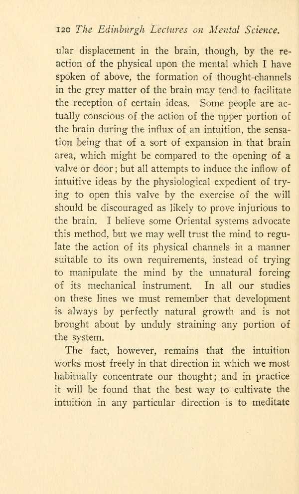 displacement in the brain, though, by the reaction of the physical upon the mental which I have spoken of above, the formation of thought-channels in the grey matter of the brain may tend to facilitate the reception of certain ideas. Some people are actually conscious of the action of the upper portion of the brain during the influx of an intuition, the sensation being that of a sort of expansion in that brain area, which might be compared to the opening of a valve or door; but all attempts to induce the inflow of intuitive ideas by the physiological expedient of trying to open this valve by the exercise of the will should be discouraged as likely to prove injurious to the brain. I believe some Oriental systems advocate this method, but we may well trust the mind to regulate the action of its physical channels in a manner suitable to its own requirements, instead of trying to manipulate the mind by the unnatural forcing of its mechanical instrument. In all our studies on these lines we must remember that development is always by perfectly natural growth and is not brought about by unduly straining any portion of the system.
