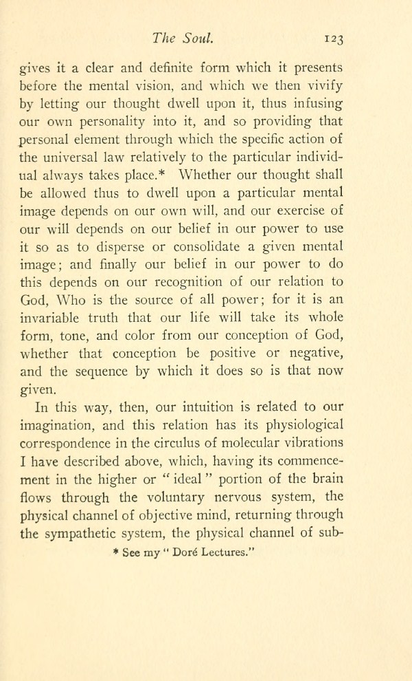 In this way, then, our intuition is related to our imagination, and this relation has its physiological correspondence in the circulus of molecular vibrations I have described above, which, having its commencement in the higher or "ideal" portion of the brain flows through the voluntary nervous system, the physical channel of objective mind, returning through the sympathetic system, the physical channel of subjective