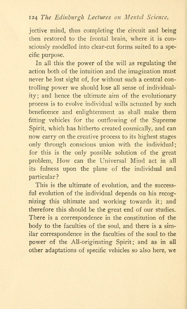 In all this the power of the will as regulating the action both of the intuition and the imagination must never be lost sight of, for without such a central controlling power we should lose all sense of individuality; and hence the ultimate aim of the evolutionary process is to evolve individual wills actuated by such beneficence and enlightenment as shall make them fitting vehicles for the outfiowing of the Supreme Spirit, which has hitherto created cosmically, and can now carry on the creative process to its highest stages only through conscious union with the individual; for this is the only possible solution of the great problem, How can the Universal Mind act in all its fulness upon the plane of the individual and particular?