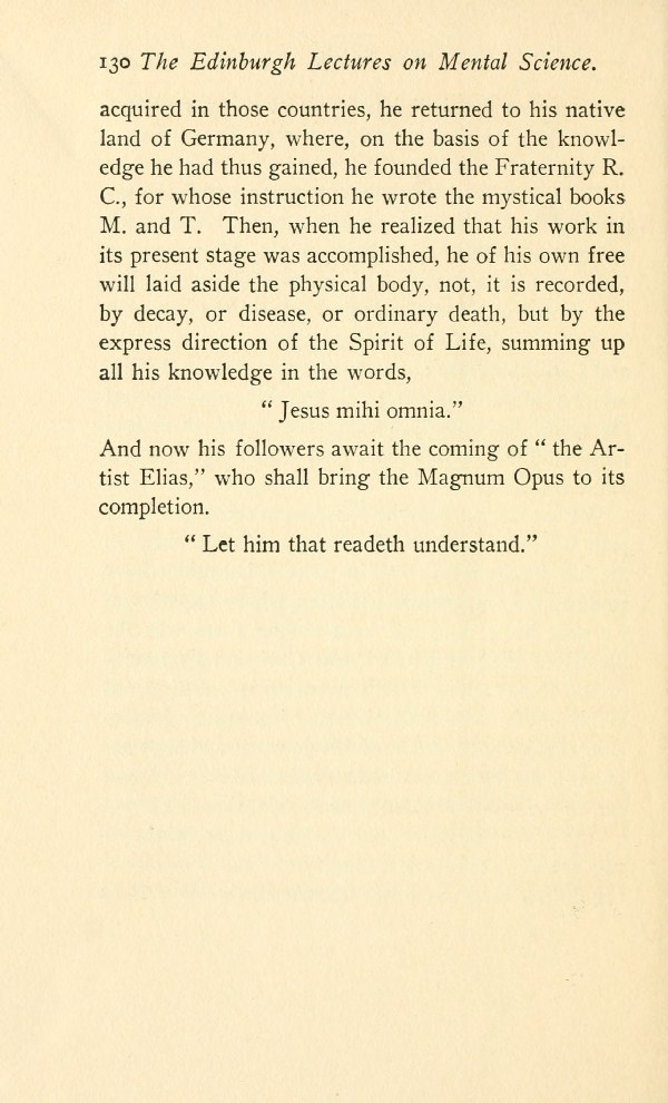 acquired in those countries, he returned to his native land of Germany, where, on the basis of the knowledge he had thus gained, he founded the Fraternity R. C., for whose instruction he wrote the mystical books M. and T. Then, when he realized that his work in its present stage was accomplished, he of his own free will laid aside the physical body, not, it is recorded, by decay, or disease, or ordinary death, but by the express direction of the Spirit of Life, summing up all his knowledge in the words,