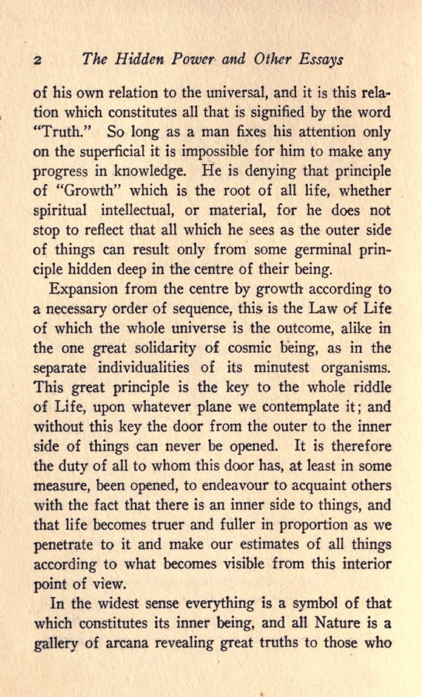 of his own relation to the universal, and it is this relation which constitutes all that is signified by the word "Truth." So long as a man fixes his attention only on the superficial it is impossible for him to make any progress in knowledge. He is denying that principle of "Growth" which is the root of all life, whether spiritual intellectual, or material, for he does not stop to reflect that all which he sees as the outer side of things can result only from some germinal principle hidden deep in the centre of their being.