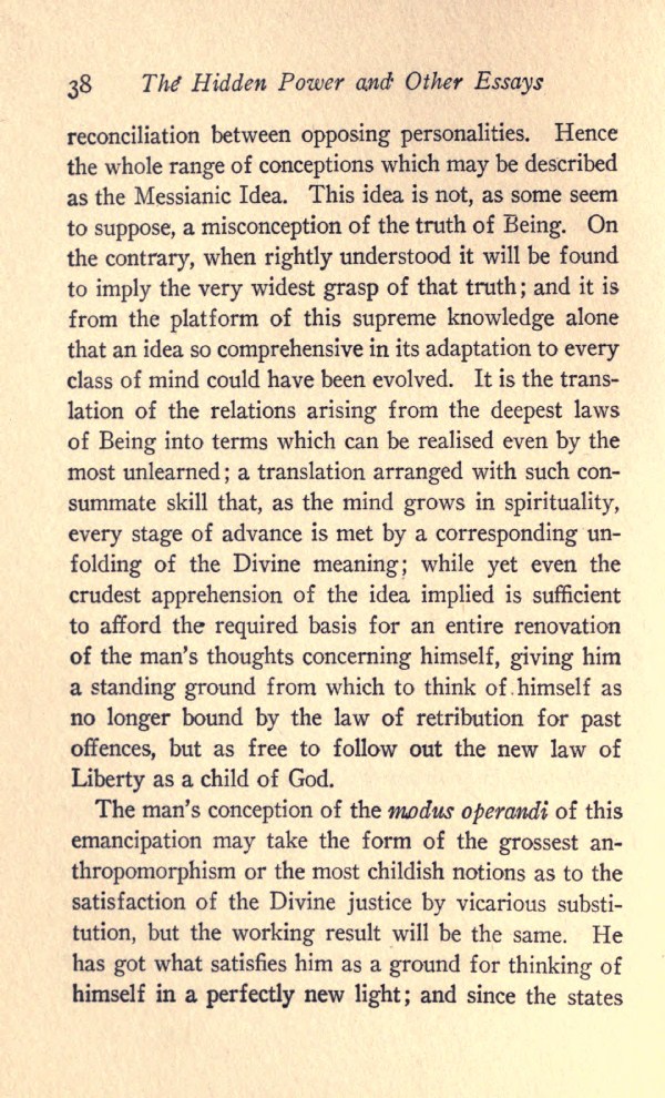 reconciliation between opposing personalities. Hence the whole range of conceptions which may be described as the Messianic Idea. This idea is not, as some seem to suppose, a misconception of the truth of Being. On the contrary, when rightly understood it will be found to imply the very widest grasp of that truth; and it is from the platform of this supreme knowledge alone that an idea so comprehensive in its adaptation to every class of mind could have been evolved. It is the translation of the relations arising from the deepest laws of Being into terms which can be realised even by the most unlearned; a translation arranged with such consummate skill that, as the mind grows in spirituality, every stage of advance is met by a corresponding unfolding of the Divine meaning; while yet even the crudest apprehension of the idea implied is sufficient to afford the required basis for an entire renovation of the man's thoughts concerning himself, giving him a standing ground from which to think of himself as no longer bound by the law of retribution for past offences, but as free to follow out the new law of Liberty as a child of God.